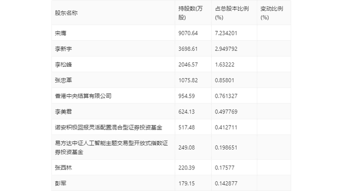 年报显示,2023年年末公司十大流通股东中,新进股东为易方达中证人工智能主题交易型开放式指数证券投资基金、张西林、彭军,取代了三季度末的深圳市海云天投资控股有限公司、金鹰改革红利灵活配置混合型证券投资基金、万家中证1000指数增强型发起式证券投资基金。在具体持股比例上,香港中央结算有限公司持股有所上升,李松峰、张忠革、诺安积极回报灵活配置混合型证券投资基金持股有所下降。