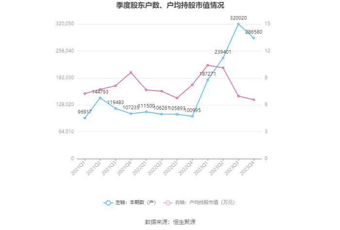 筹码集中度方面,截至2023年年末,公司股东总户数为28.66万户,较三季度末下降了3.34万户,降幅10.45%;户均持股市值由三季度末的6.98万元下降至6.58万元,降幅为5.73%。