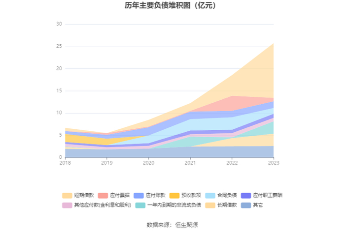 负债重大变化方面,截至2023年年末,公司短期借款较上年末增加165.14%,占公司总资产比重上升12.99个百分点;一年内到期的非流动负债较上年末增加1428.42%,占公司总资产比重上升4.91个百分点;应付票据较上年末减少77.24%,占公司总资产比重下降6.08个百分点;合同负债较上年末减少53.67%,占公司总资产比重下降3.77个百分点。