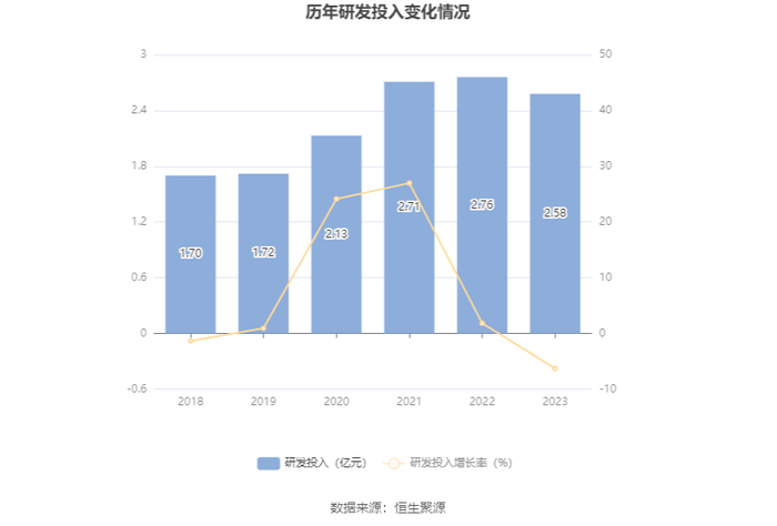2023年全年,公司研发投入金额为2.58亿元,同比下降6.30%;研发投入占营业收入比例为8.19%,相比上年同期下降4.14个百分点。此外,公司全年研发投入资本化率为24.16%。