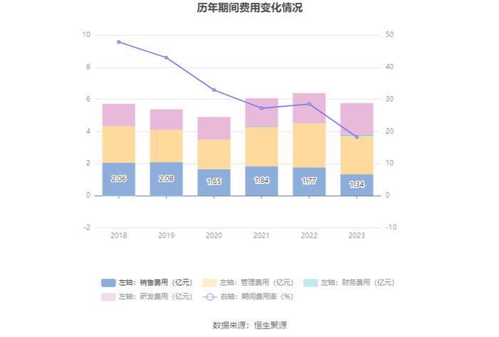 2023年,公司期间费用为5.76亿元,较上年同期减少6302.23万元;期间费用率为18.26%,较上年同期下降10.31个百分点。其中,销售费用同比下降24.09%,管理费用同比下降13.27%,研发费用同比增长3.41%,财务费用由去年同期的-52.31万元变为880.79万元。