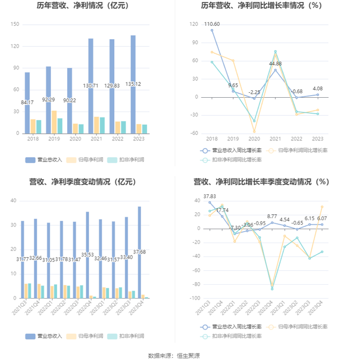 2023年,公司毛利率为34.11%,同比下降10.76个百分点;净利率为9.92%,较上年同期下降3.33个百分点。从单季度指标来看,2023年第四季度公司毛利率为31.81%,同比下降10.26个百分点,环比上升1.06个百分点;净利率为4.39%,较上年同期上升0.45个百分点,较上一季度下降4.24个百分点。