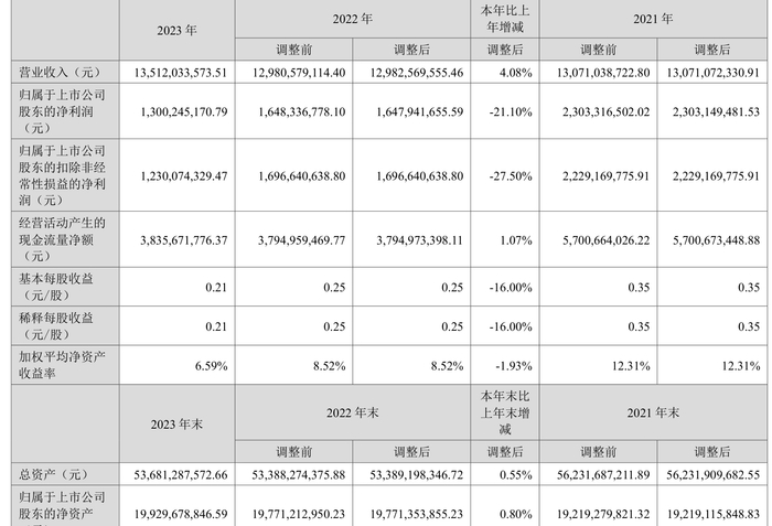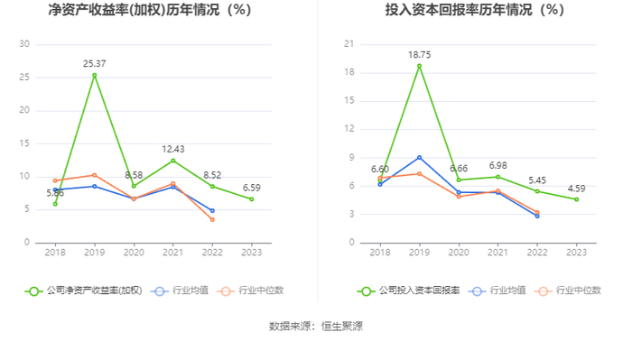 数据显示,2023年公司加权平均净资产收益率为6.59%,较上年同期下降1.93个百分点;公司2023年投入资本回报率为4.59%,较上年同期下降0.86个百分点。