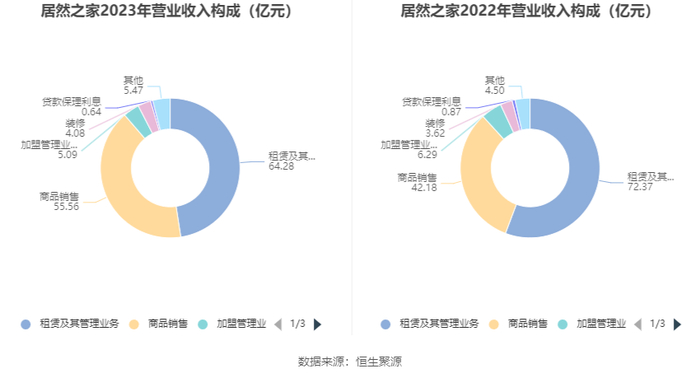 分产品来看,2023年公司主营业务中,租赁及其管理业务收入64.28亿元,占营业收入的47.57%;商品销售收入55.56亿元,占营业收入的41.12%;加盟管理业务收入5.09亿元,占营业收入的3.77%。