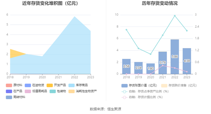 从存货变动来看,截至2023年年末,公司存货账面价值为4.38亿元,占净资产的2.2%,较上年末减少1.48亿元。其中,存货跌价准备为51.08万元,计提比例为0.12%。