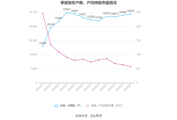 筹码集中度方面,截至2023年年末,公司股东总户数为3.63万户,较三季度末增长了725户,增幅2.04%;户均持股市值由三季度末的64.68万元下降至57.15万元,降幅为11.64%。