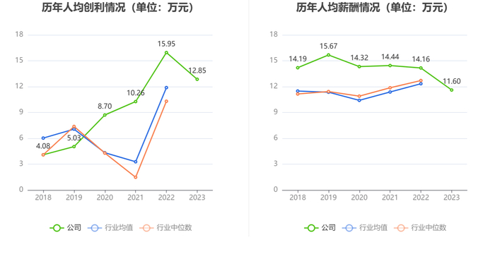截至2023年末,公司员工总数为43031人,人均创收263.51万元,人均创利12.85万元,人均薪酬11.60万元,较上年同期分别下降28.50%、19.42%、18.11%。