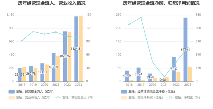 2023年,公司经营活动现金流净额为239.96亿元,同比增长159.78%;筹资活动现金流净额-12.55亿元,同比减少74.28亿元;投资活动现金流净额-186.69亿元,上年同期为-89.66亿元。