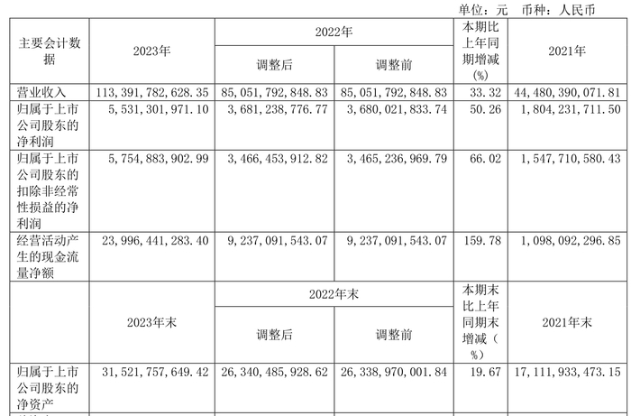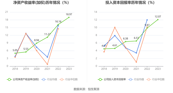 数据显示,2023年公司加权平均净资产收益率为18.97%,较上年同期增长2.81个百分点;公司2023年投入资本回报率为12.07%,较上年同期增长2.20个百分点。
