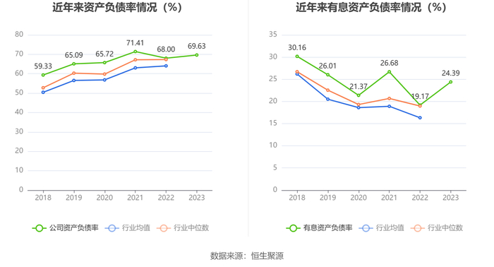 在偿债能力方面,公司2023年年末资产负债率为69.63%,相比上年末上升1.63个百分点;有息资产负债率为24.39%,相比上年末上升5.22个百分点。