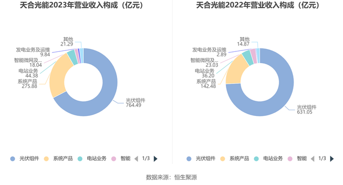 分产品来看,2023年公司主营业务中,光伏组件收入764.49亿元,同比增长21.15%,占营业收入的67.42%;系统产品收入275.88亿元,同比增长93.63%,占营业收入的24.33%;电站业务收入44.38亿元,同比增长22.60%,占营业收入的3.91%。