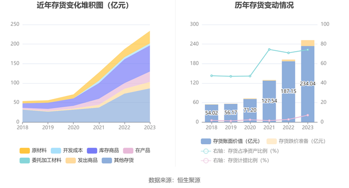 从存货变动来看,截至2023年年末,公司存货账面价值为234.04亿元,占净资产的74.25%,较上年末增加46.89亿元。其中,存货跌价准备为18.05亿元,计提比例为7.16%。