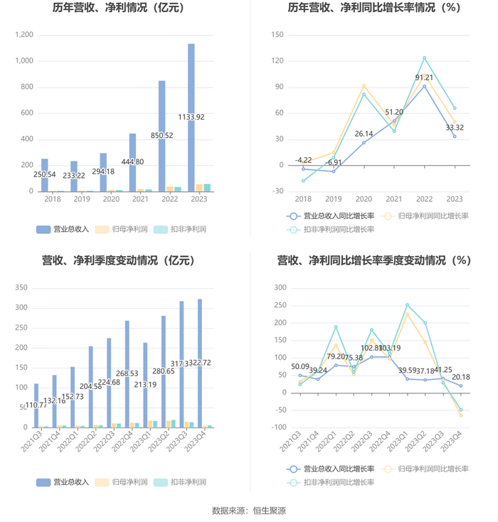 中证智能财讯 天合光能(688599)4月26日披露2023年年报。2023年,公司实现营业总收入1133.92亿元,同比增长33.32%;归母净利润55.31亿元,同比增长50.26%;扣非净利润57.55亿元,同比增长66.02%;经营活动产生的现金流量净额为239.96亿元,同比增长159.78%;报告期内,天合光能基本每股收益为2.55元,加权平均净资产收益率为18.97%。公司2023年年度利润分配预案为:拟向全体股东每10股派6.33元(含税)。