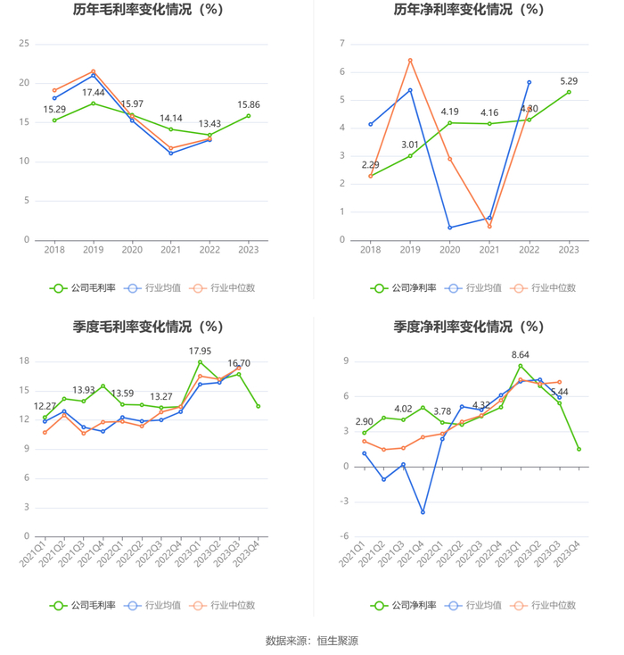 2023年,公司毛利率为15.86%,同比上升2.43个百分点;净利率为5.29%,较上年同期上升0.99个百分点。从单季度指标来看,2023年第四季度公司毛利率为13.41%,同比上升0.04个百分点,环比下降3.29个百分点;净利率为1.50%,较上年同期下降3.59个百分点,较上一季度下降3.94个百分点。