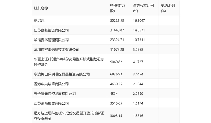 年报显示,2023年年末公司十大流通股东中,持股最多的为高纪凡,占比16.20%。十大流通股东名单相比2023年三季报维持不变。在具体持股比例上,华夏上证科创板50成份交易型开放式指数证券投资基金、香港中央结算有限公司、易方达上证科创板50成份交易型开放式指数证券投资基金持股有所下降。