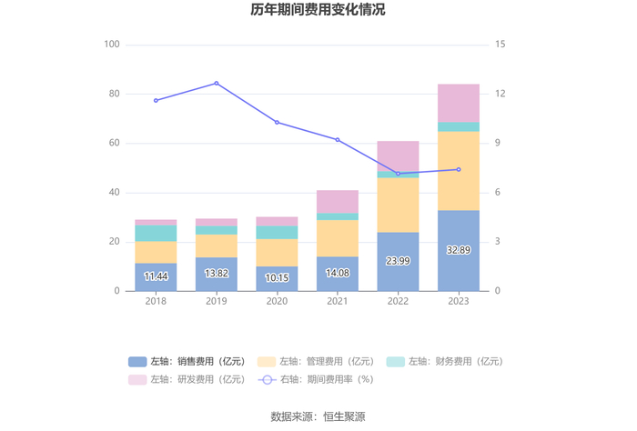 2023年,公司期间费用为84.12亿元,较上年同期增加23.11亿元;期间费用率为7.42%,较上年同期上升0.25个百分点。其中,销售费用同比增长37.07%,管理费用同比增长44.88%,研发费用同比增长26.42%,财务费用同比增长39.6%。