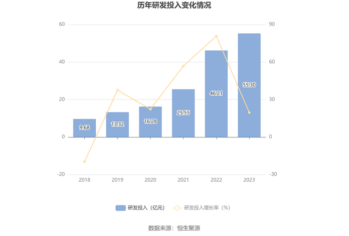 2023年全年,公司研发投入金额为55.30亿元,同比增长19.69%;研发投入占营业收入比例为4.88%,相比上年同期下降0.55个百分点。