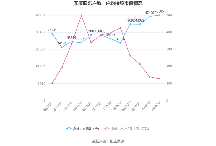 筹码集中度方面,截至2023年年末,公司股东总户数为4.81万户,较三季度末增长了665户,增幅1.40%;户均持股市值由三季度末的140.12万元下降至128.96万元,降幅为7.96%。