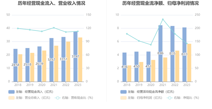 2023年,公司营业收入现金比为113.15%,净现比为143.18%。