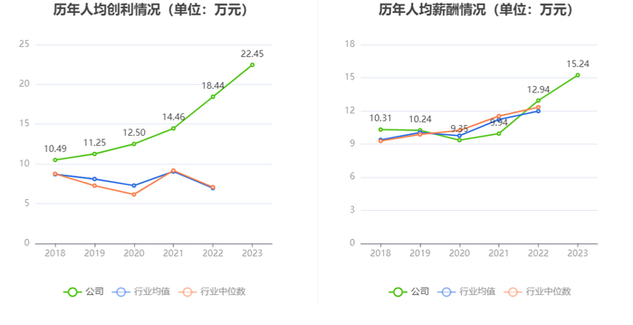 截至2023年末,公司员工总数为2530人,人均创收130.89万元,人均创利22.45万元,人均薪酬15.24万元,较上年同期分别增长10.05%、21.80%、17.70%。