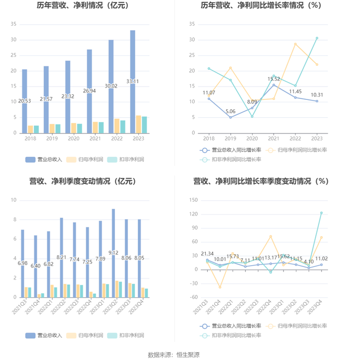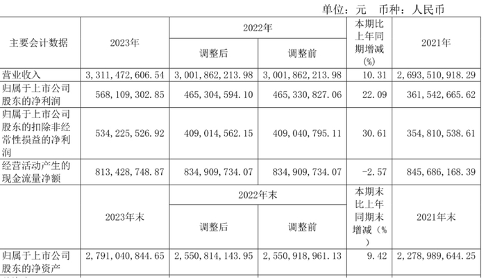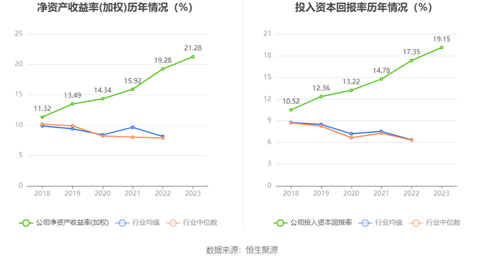 数据显示,2023年公司加权平均净资产收益率为21.28%,较上年同期增长2.00个百分点;公司2023年投入资本回报率为19.15%,较上年同期增长1.80个百分点。
