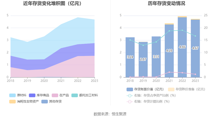 从存货变动来看,截至2023年年末,公司存货账面价值为4.67亿元,占净资产的16.74%,较上年末减少1905.85万元。其中,存货跌价准备为586.82万元,计提比例为1.24%。