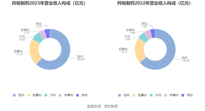 分产品来看,2023年公司主营业务中,贴剂收入20.47亿元,同比增长6.91%,占营业收入的61.80%;胶囊剂收入7.12亿元,同比增长15.44%,占营业收入的21.50%;片剂收入2.62亿元,同比增长34.66%,占营业收入的7.91%。