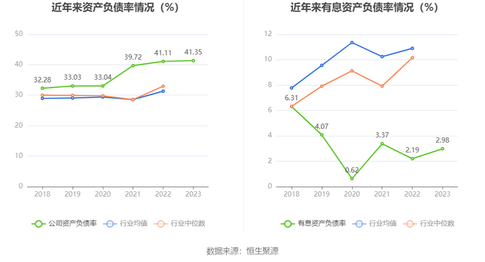 在偿债能力方面,公司2023年年末资产负债率为41.35%,相比上年末上升0.24个百分点;有息资产负债率为2.98%,相比上年末上升0.79个百分点。