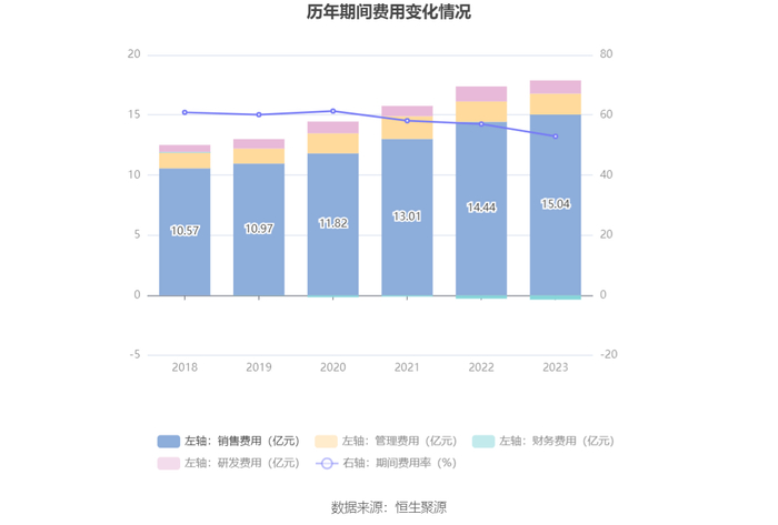 2023年,公司期间费用为17.53亿元,较上年同期增加4113.53万元;但期间费用率为52.92%,较上年同期下降4.09个百分点。其中,销售费用同比增长4.18%,管理费用同比增长2.83%,研发费用同比下降12.32%,财务费用由去年同期的-2658.76万元变为-3512.03万元。