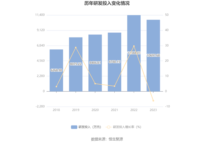2023年全年,公司研发投入金额为1.07亿元,同比下降6.06%;研发投入占营业收入比例为3.23%,相比上年同期下降0.56个百分点。此外,公司全年研发投入资本化率为6.46%。
