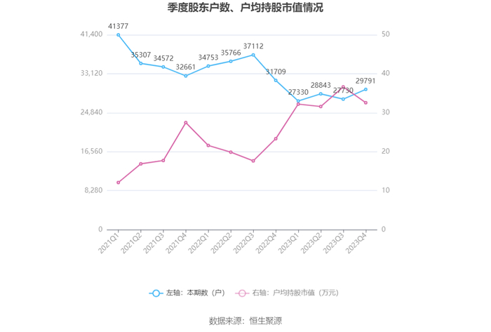 筹码集中度方面,截至2023年年末,公司股东总户数为2.98万户,较三季度末增长了2061户,增幅7.43%;户均持股市值由三季度末的36.63万元下降至32.57万元,降幅为11.08%。