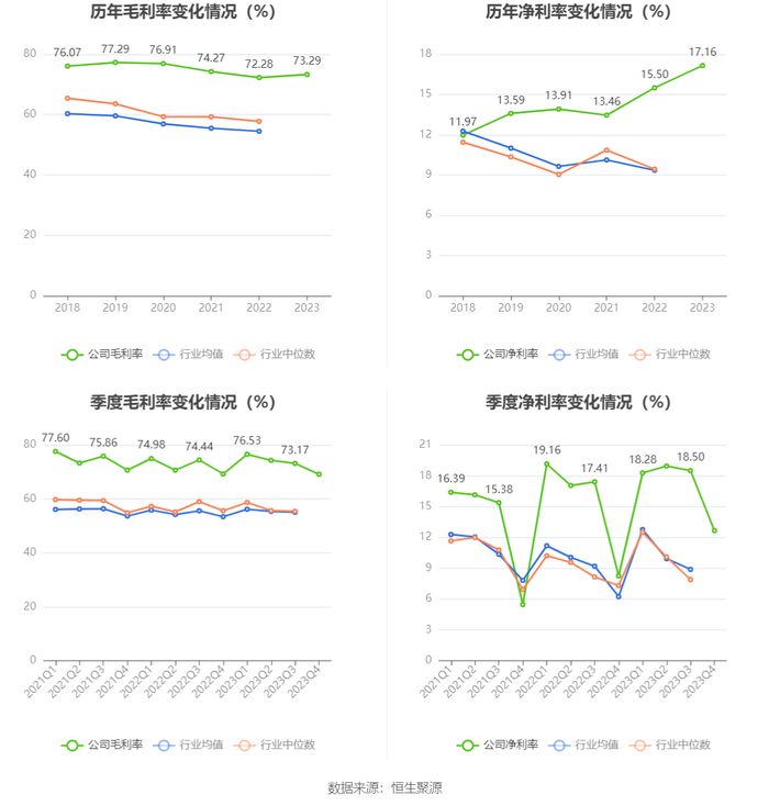 2023年,公司毛利率为73.29%,同比上升1.01个百分点;净利率为17.16%,较上年同期上升1.66个百分点。从单季度指标来看,2023年第四季度公司毛利率为69.14%,同比下降0.12个百分点,环比下降4.03个百分点;净利率为12.67%,较上年同期上升4.41个百分点,较上一季度下降5.83个百分点。