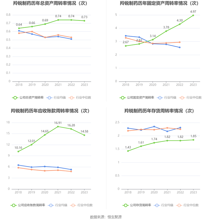 营运能力方面,2023年,公司公司总资产周转率为0.73次,上年同期为0.74次(2022年行业平均值为0.51次,公司位居同行业14/74);固定资产周转率为4.97次,上年同期为4.30次(2022年行业平均值为2.56次,公司位居同行业15/74);公司应收账款周转率、存货周转率分别为14.58次、1.85次。