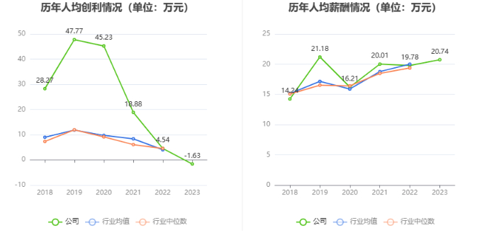 截至2023年末,公司员工总数为414人,人均创收68.20万元,人均创利-1.63万元,人均薪酬20.74万元,较上年同期分别变化-5.32%、-135.89%、4.86%。