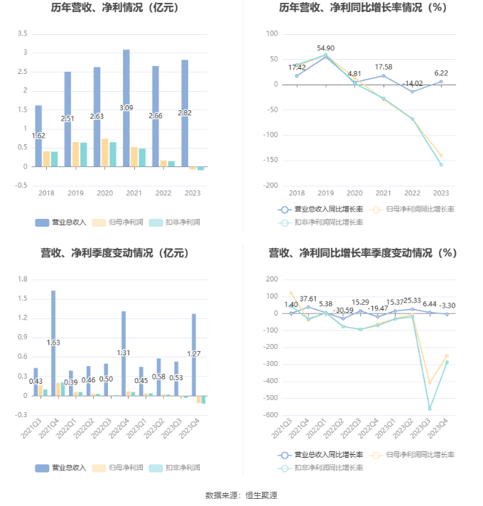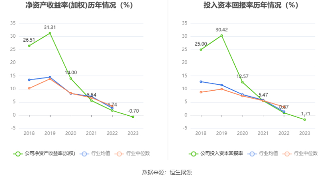 数据显示,2023年公司加权平均净资产收益率为-0.70%,较上年同期下降2.44个百分点;公司2023年投入资本回报率为-1.71%,较上年同期下降2.58个百分点。