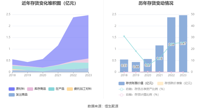 从存货变动来看,截至2023年年末,公司存货账面价值为2.47亿元,占净资产的25.87%。根据财报,公司本期没有计提存货跌价准备。
