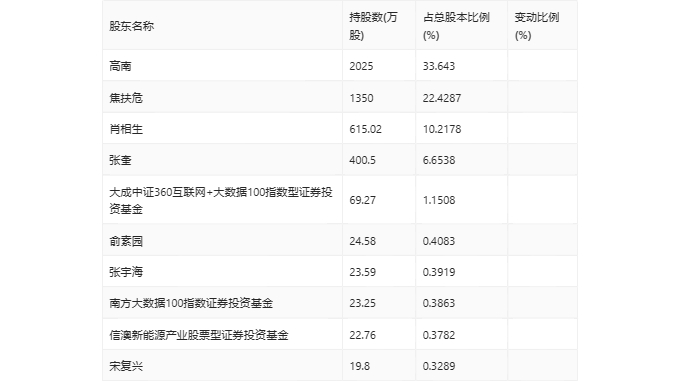 年报显示,2023年年末公司十大流通股东中,新进股东为南方大数据100指数证券投资基金、宋复兴,取代了三季度末的海创价值成长精选壹号私募证券投资基金、建信中证500指数增强型证券投资基金。在具体持股比例上,大成中证360互联网+大数据100指数型证券投资基金持股有所上升,高南、焦扶危、肖相生、张奎、俞素园、张宇海、信澳新能源产业股票型证券投资基金持股有所下降。