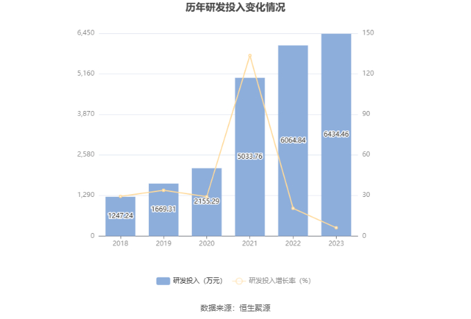 2023年全年,公司研发投入金额为6434.46万元,同比增长6.09%;研发投入占营业收入比例为22.79%,相比上年同期下降0.03个百分点。
