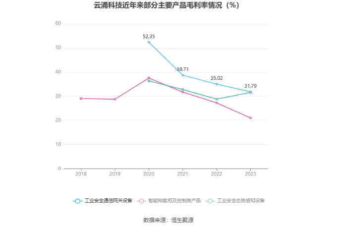 分产品看,工业安全通信网关设备、智能档案柜及控制类产品、工业安全态势感知设备2023年毛利率分别为31.79%、21.00%、31.57%。
