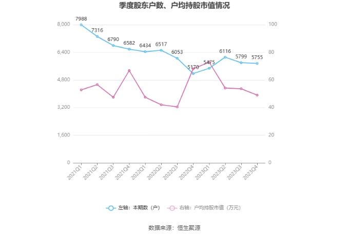 筹码集中度方面,截至2023年年末,公司股东总户数为5755户,较三季度末下降了44户,降幅0.76%;户均持股市值由三季度末的53.64万元下降至49.04万元,降幅为8.58%。