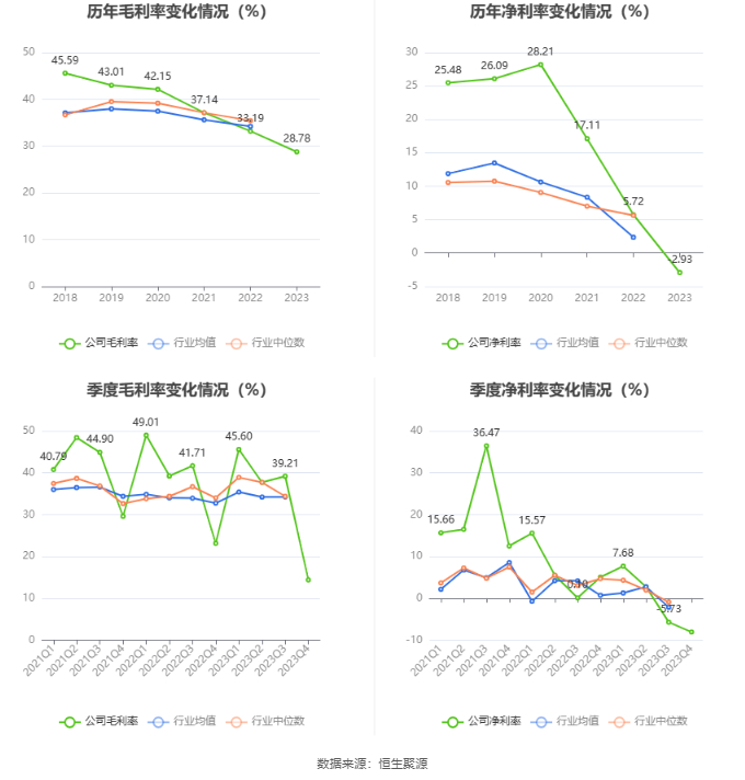 2023年,公司毛利率为28.78%,同比下降4.41个百分点;净利率为-2.93%,较上年同期下降8.65个百分点。从单季度指标来看,2023年第四季度公司毛利率为14.39%,同比下降8.74个百分点,环比下降24.82个百分点;净利率为-8.08%,较上年同期下降13.12个百分点,较上一季度下降2.35个百分点。