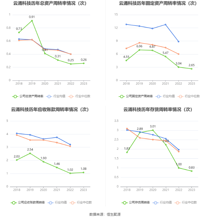 营运能力方面,2023年,公司公司总资产周转率为0.26次,上年同期为0.25次(2022年行业平均值为0.40次,公司位居同行业52/62);固定资产周转率为2.65次,上年同期为3.04次(2022年行业平均值为8.88次,公司位居同行业50/62);公司应收账款周转率、存货周转率分别为1.08次、0.83次。