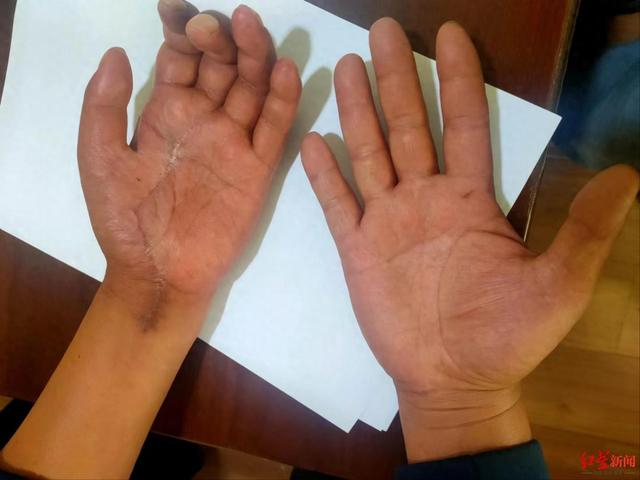红星新闻记者了解到,张女士的丈夫是42岁的吴先生。近一年前的这场遭遇,让他至今仍心存恐惧,他的左手掌留下一条长长的疤痕,“现在左手除了小拇指能正常活动,其他四个手指都无法弯曲和伸直,已经留下终身残疾。”他说。
