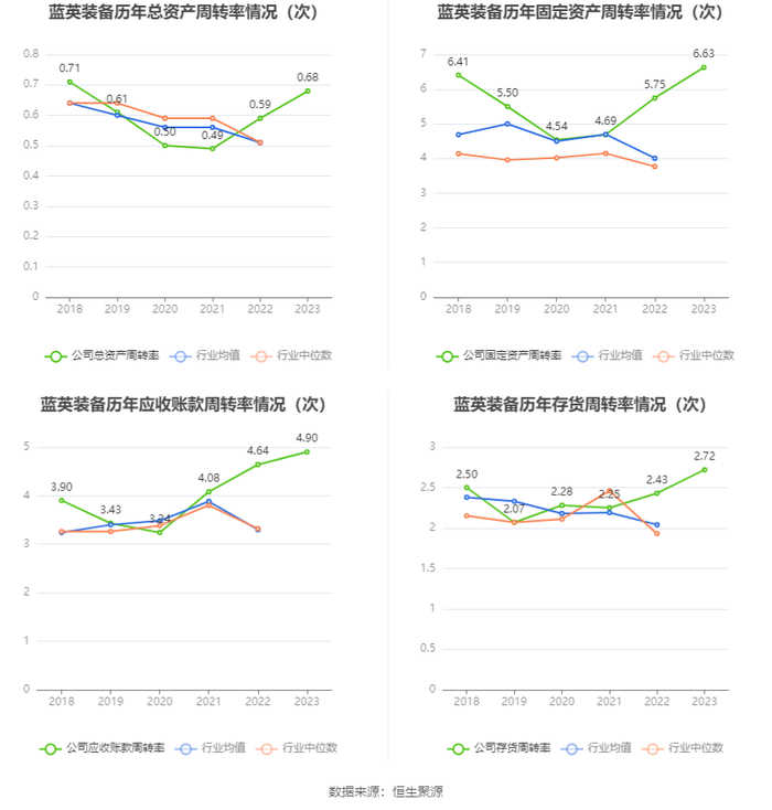 营运能力方面,2023年,公司公司总资产周转率为0.68次,上年同期为0.59次(2022年行业平均值为0.51次,公司位居同行业34/87);固定资产周转率为6.63次,上年同期为5.75次(2022年行业平均值为4.01次,公司位居同行业27/87);公司应收账款周转率、存货周转率分别为4.90次、2.72次。