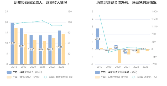 2023年,公司营业收入现金比为111.69%,净现比为-4.29%。
