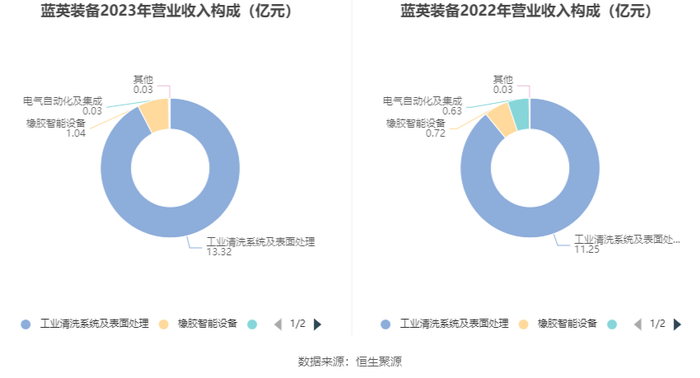 分产品来看,2023年公司主营业务中,工业清洗系统及表面处理收入13.32亿元,同比增长18.34%,占营业收入的92.37%;橡胶智能设备收入1.04亿元,同比增长43.80%,占营业收入的7.20%;电气自动化及集成收入0.03亿元,同比下降94.68%,占营业收入的0.23%。