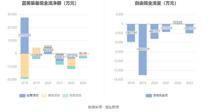 进一步统计发现,2023年公司自由现金流为-2991.33万元,上年同期为935.02万元。