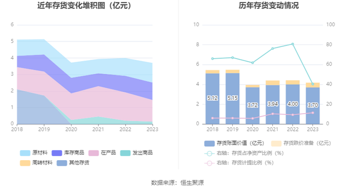 从存货变动来看,截至2023年年末,公司存货账面价值为3.7亿元,占净资产的40.4%,较上年末减少3020.21万元。其中,存货跌价准备为4776.1万元,计提比例为11.43%。