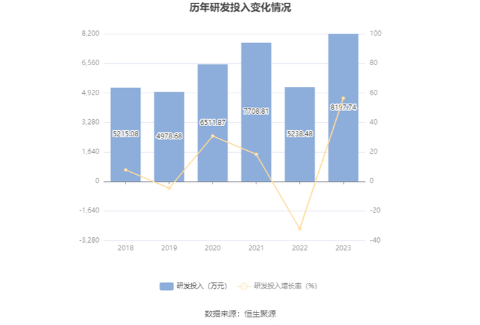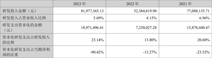 2023年全年,公司研发投入金额为8197.74万元,同比增长56.49%;研发投入占营业收入比例为5.69%,相比上年同期上升1.54个百分点。此外,公司全年研发投入资本化率为23.14%。