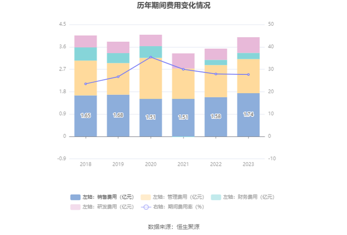 2023年,公司期间费用为3.99亿元,较上年同期增加4632.95万元;但期间费用率为27.67%,较上年同期下降0.24个百分点。其中,销售费用同比增长10.43%,管理费用同比增长5.97%,研发费用同比增长39.53%,财务费用同比增长20.72%。